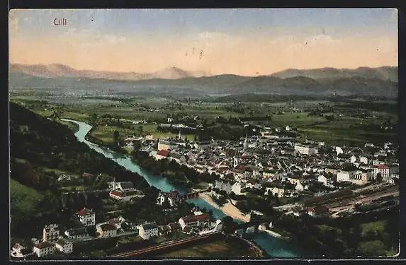 AK Cilli, Ortsansicht mit Brücke in der Dämmerung