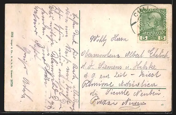 Personenbezogene Daten auf der Rückseite der Karte wurden durch blauen Textmarker unkenntlich gemacht. Die blauen Stellen sind auf die Vorderseite durchgeweicht und wirken sich negativ auf das Postkartenfoto aus