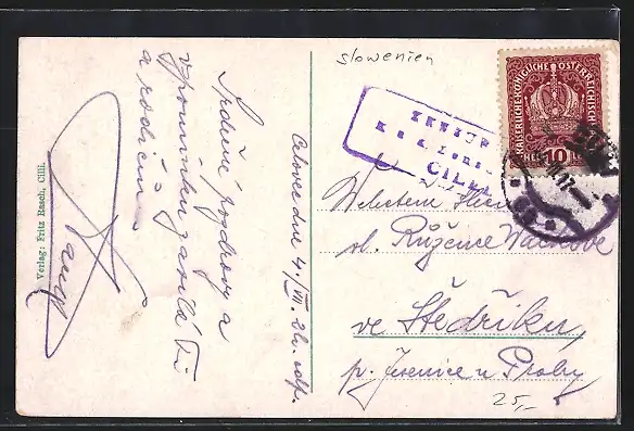 AK Cilli, Strassenpartien, Totalansicht, Blick zur Burg