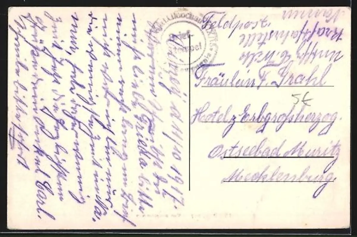 Personenbezogene Daten auf der Rückseite der Karte wurden durch blauen Textmarker unkenntlich gemacht. Die blauen Stellen sind auf die Vorderseite durchgeweicht und wirken sich negativ auf das Postkartenfoto aus