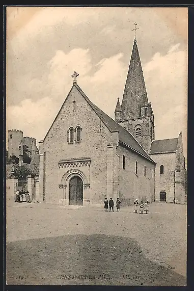 AK Cinq-Mars la Pile, Église avec place et habitants devant l`entrée