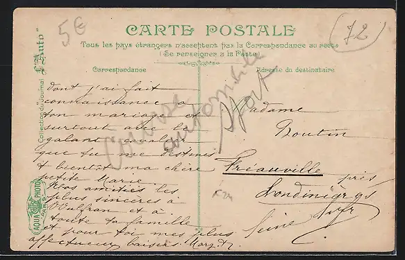 Personenbezogene Daten auf der Rückseite der Karte wurden durch blauen Textmarker unkenntlich gemacht. Die blauen Stellen sind auf die Vorderseite durchgeweicht und wirken sich negativ auf das Postkartenfoto aus