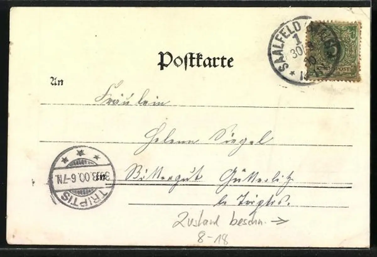 alte Ansichtskarte, gelaufen 1900, li. beschnitten, Eckknicke li. oben
