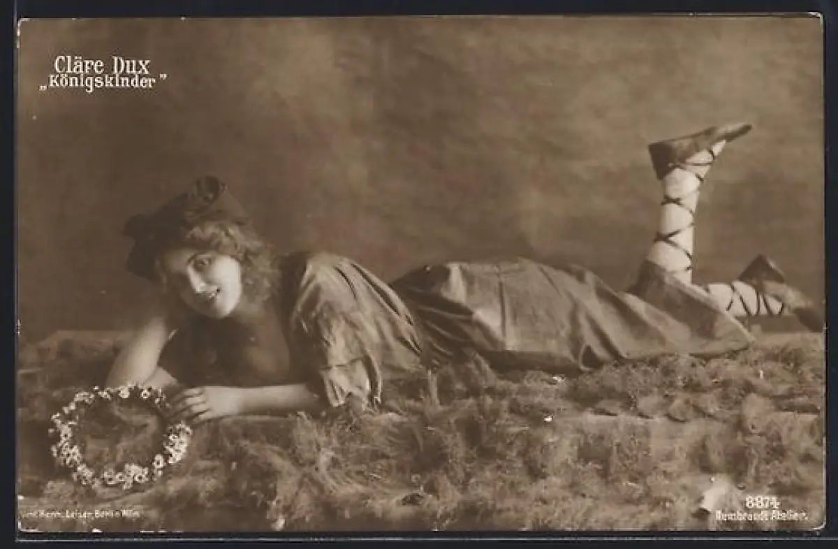 AK Cläre Dux, bäuchlings mit Blumenkranz in Königskinder