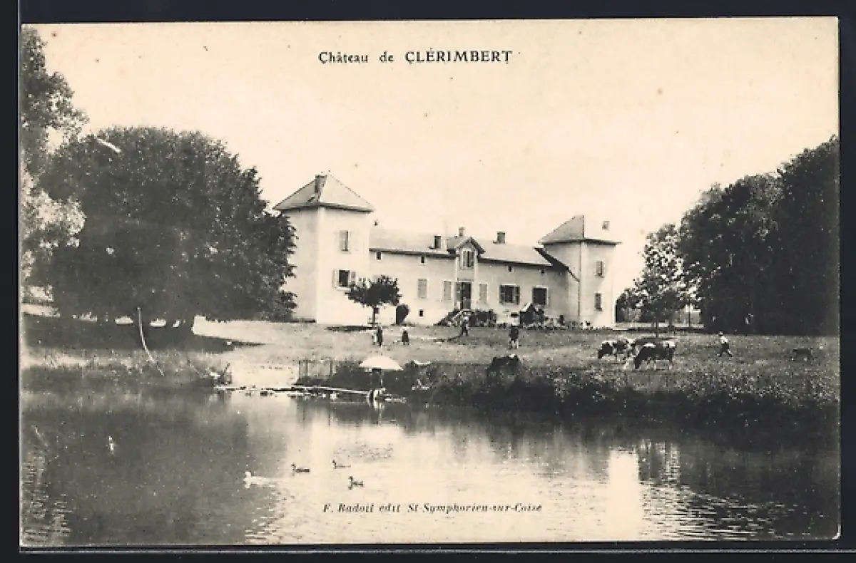 AK Clérimbert, Vue du château et de l`étang avec des canards et des vaches pâturant