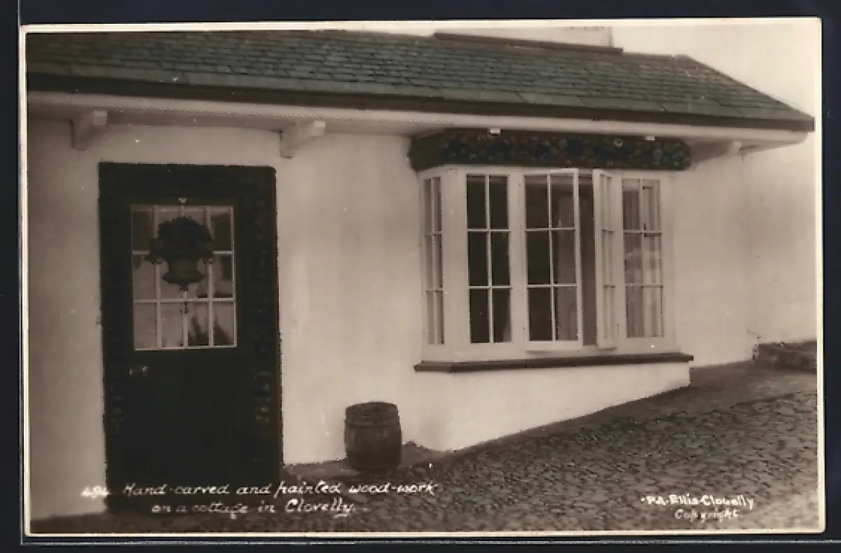 AK Clovelly, Hand-carved and painted woodwork on a cottage