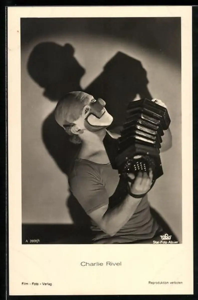 AK Clown Charlie Rivel mit einer Ziehharmonika