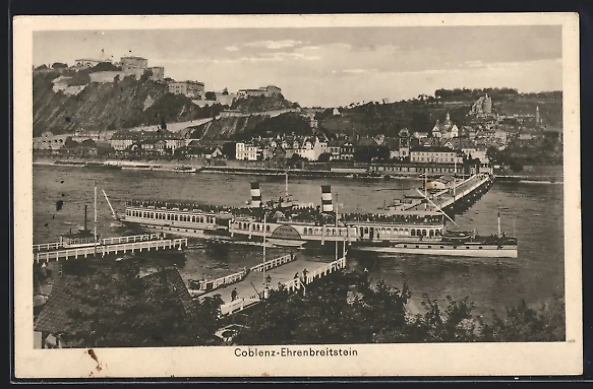 AK Coblenz-Ehrenbreitstein, Dampfer, Festung Ehrenbreitstein, Rheinansicht