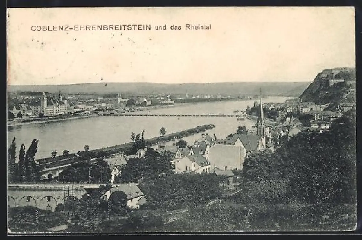 AK Coblenz-Ehrenbreitstein, Ortsansicht mit Rheintal