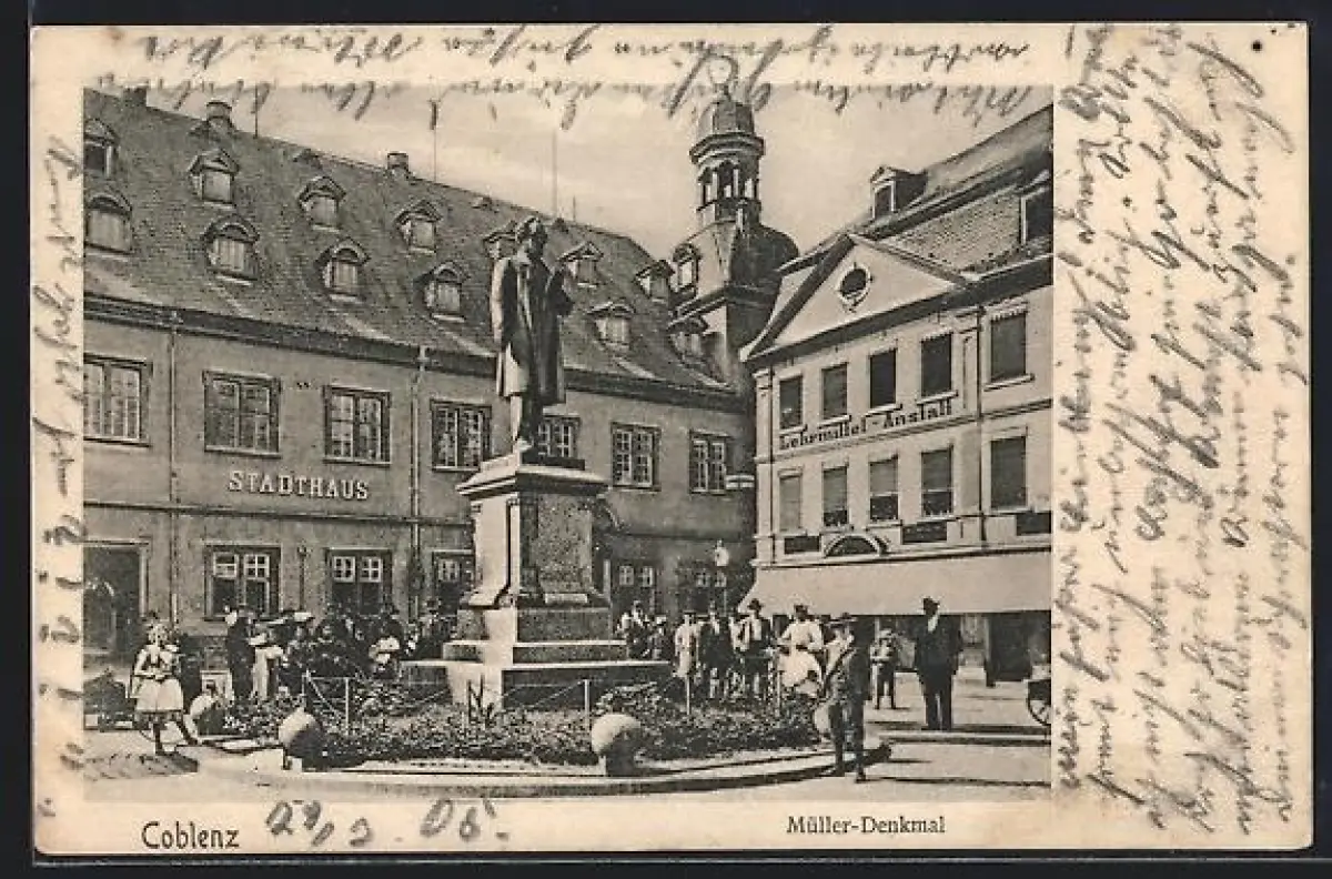 AK Coblenz, Müller-Denkmal mit Stadthaus u. Lehrmittel-Anstalt