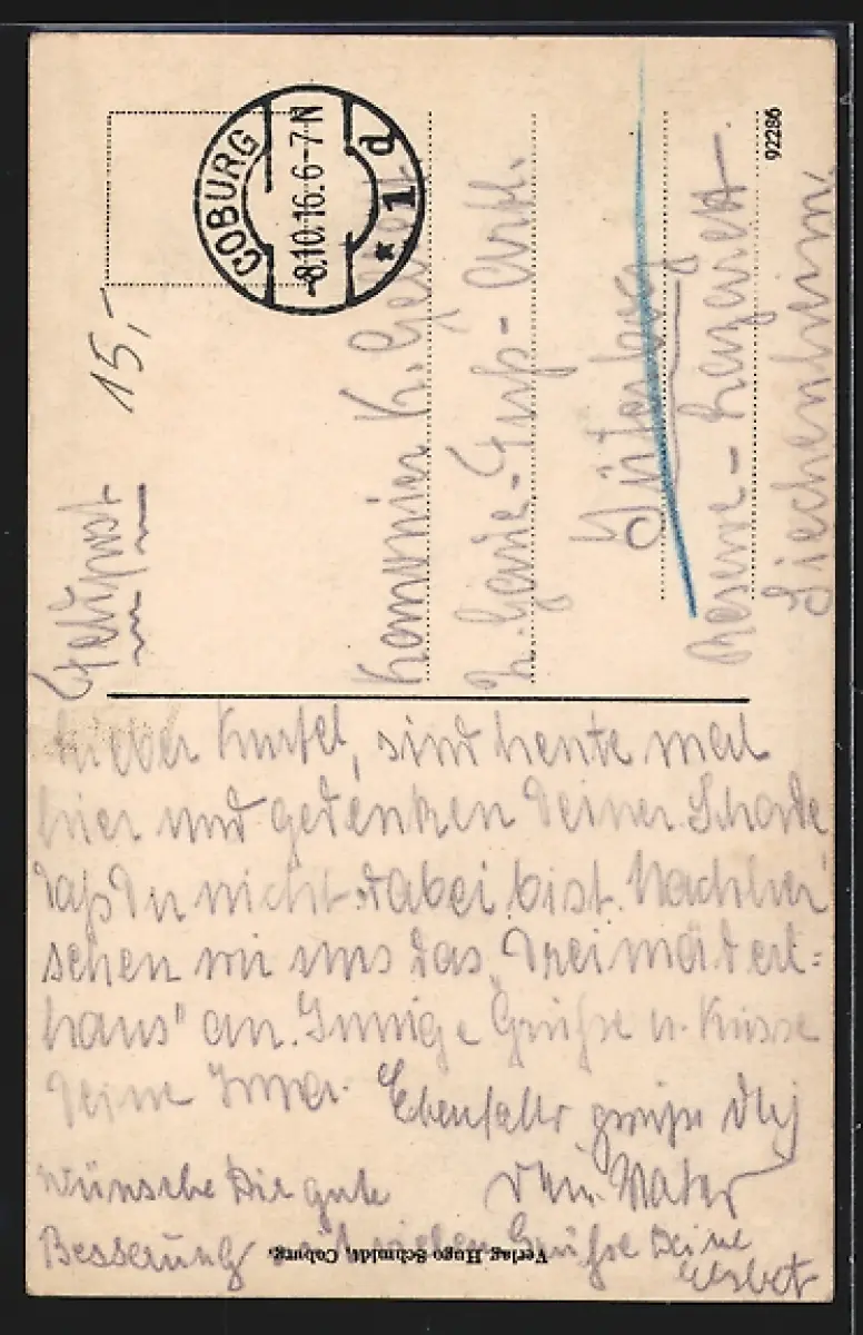 Personenbezogene Daten auf der Rückseite der Karte wurden durch blauen Textmarker unkenntlich gemacht. Die blauen Stellen sind auf die Vorderseite durchgeweicht und wirken sich negativ auf das Postkartenfoto aus