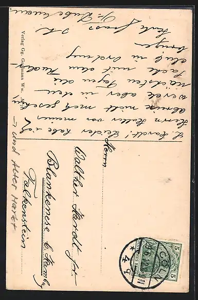Personenbezogene Daten auf der Rückseite der Karte wurden durch blauen Textmarker unkenntlich gemacht. Die blauen Stellen sind auf die Vorderseite durchgeweicht und wirken sich negativ auf das Postkartenfoto aus