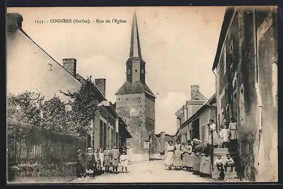 AK Cogners, Rue de l`Église avec habitants devant l`église