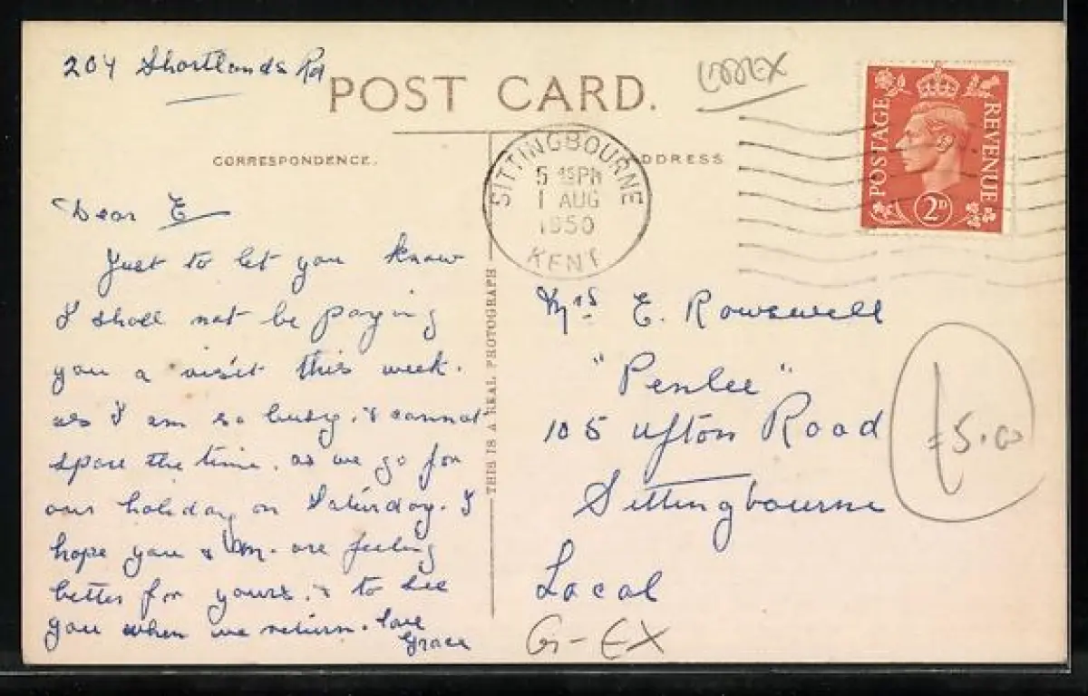 Personenbezogene Daten auf der Rückseite der Karte wurden durch blauen Textmarker unkenntlich gemacht. Die blauen Stellen sind auf die Vorderseite durchgeweicht und wirken sich negativ auf das Postkartenfoto aus