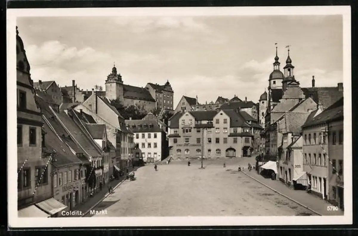AK Colditz, Markt mit Städt. Spar- u. Girokasse