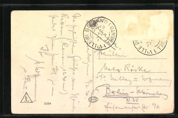 Personenbezogene Daten auf der Rückseite der Karte wurden durch blauen Textmarker unkenntlich gemacht. Die blauen Stellen sind auf die Vorderseite durchgeweicht und wirken sich negativ auf das Postkartenfoto aus