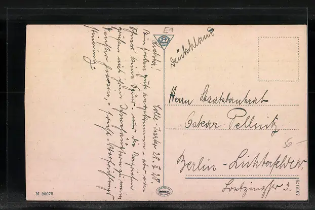 Personenbezogene Daten auf der Rückseite der Karte wurden durch blauen Textmarker unkenntlich gemacht. Die blauen Stellen sind auf die Vorderseite durchgeweicht und wirken sich negativ auf das Postkartenfoto aus