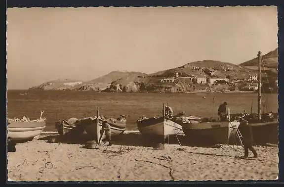 AK Collioure, La Plage avec bateaux de pêche et vue sur les collines environnantes