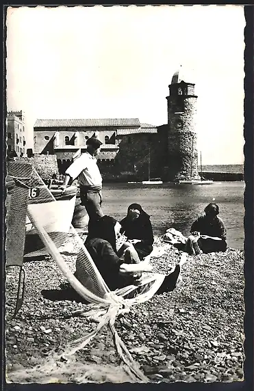 AK Collioure, Pêcheurs réparant les filets devant l`église Notre-Dame-des-Anges