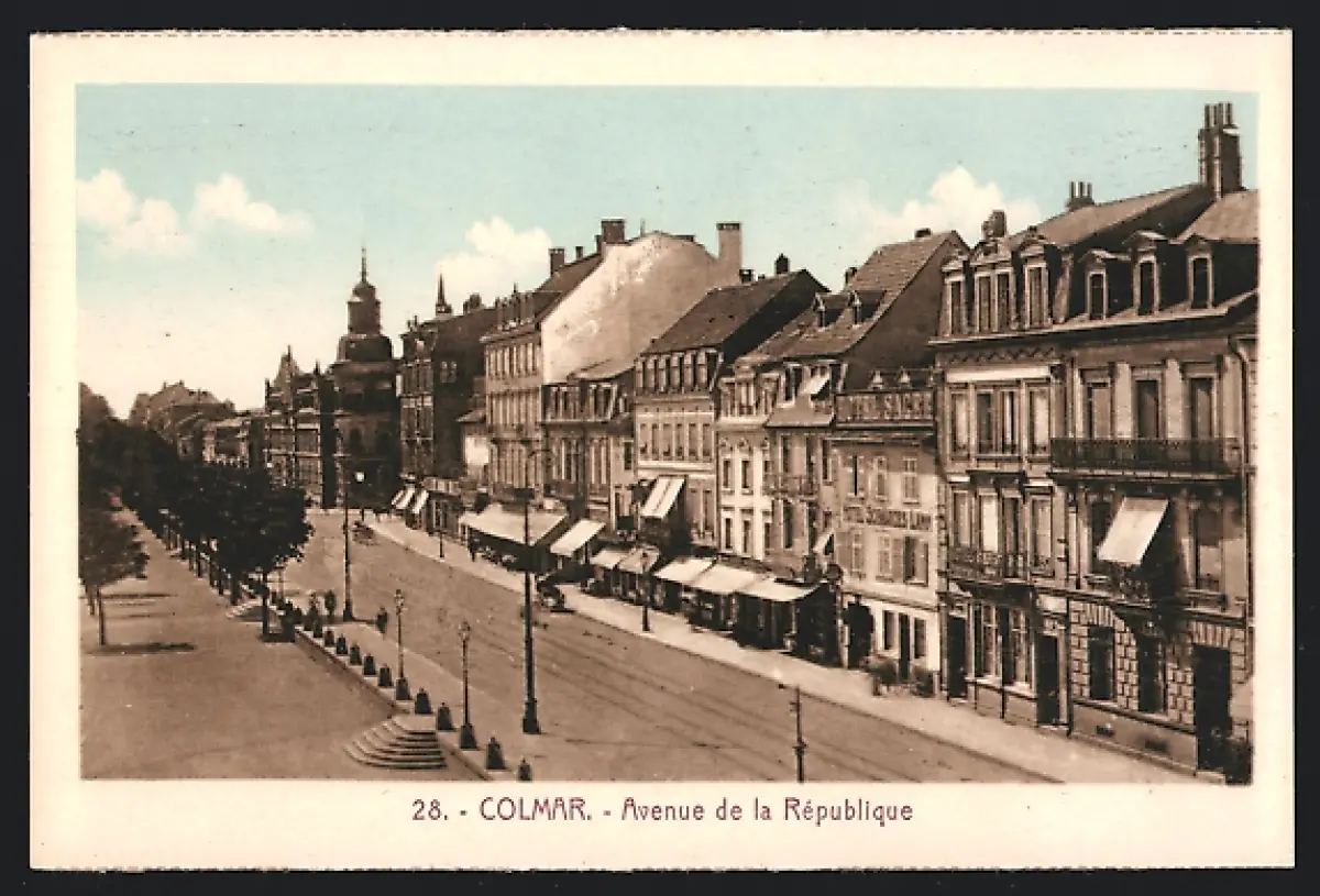 AK Colmar, Avenue de la République avec bâtiments historiques et arbres alignés