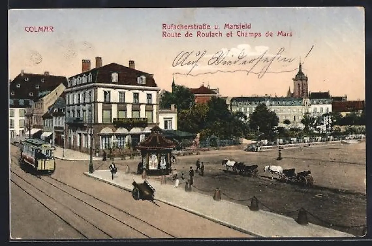 AK Colmar, Route de Roufach et Champs de Mars et Tramway, Strassenbahn