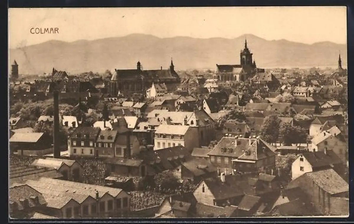 AK Colmar, Vue panoramique sur la ville avec montagnes en arrière-plan