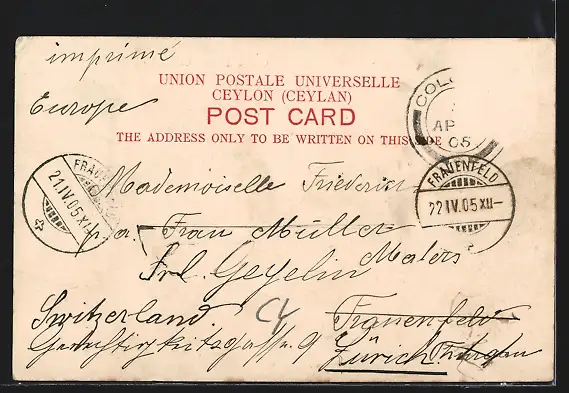gelaufen 1905, Briefmarke entfernt, rückseitig Oberflächenschaden, guter Zustand