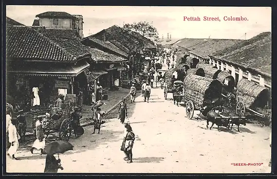 AK Colombo, Pettah Street, Strassenpartie mit Bullengespann