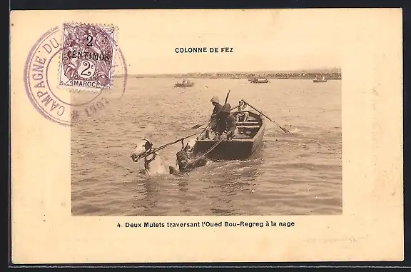 AK Colonne de Fez, Deux Mulets traversant l`Oued Bou-Regreg à la nage