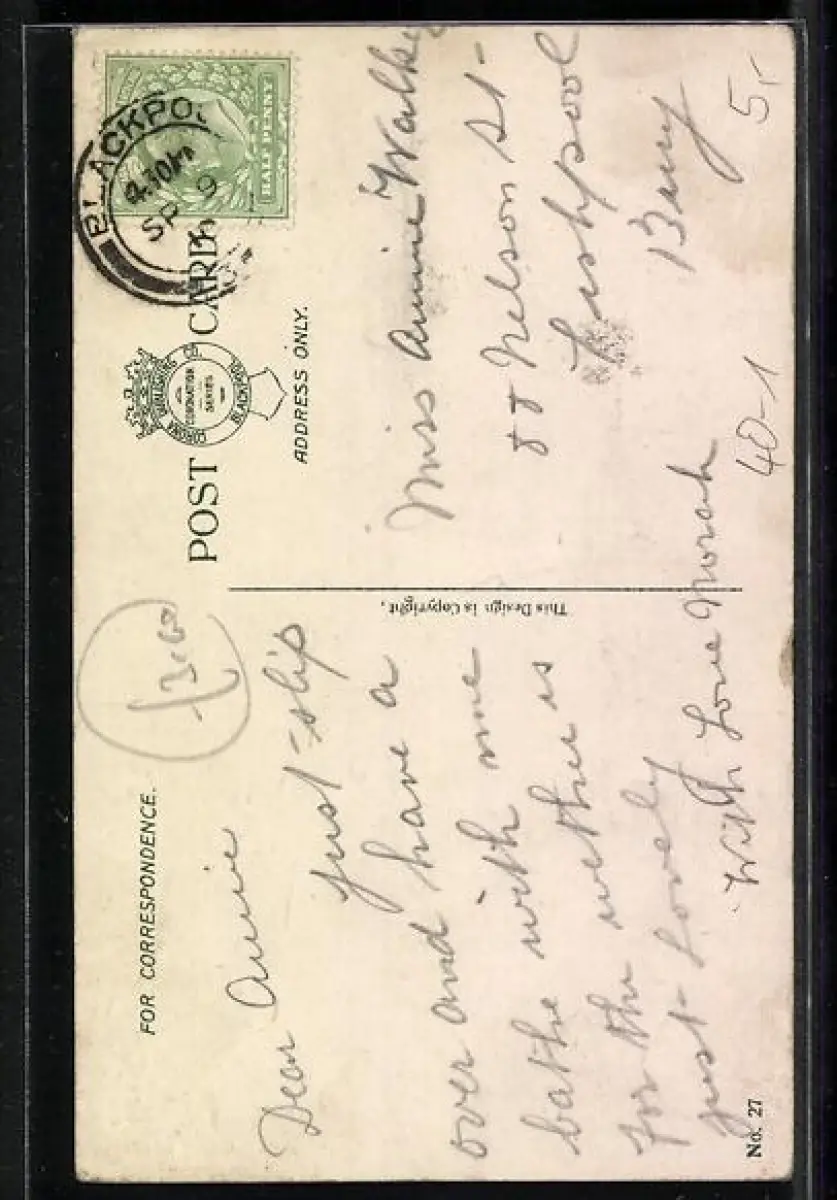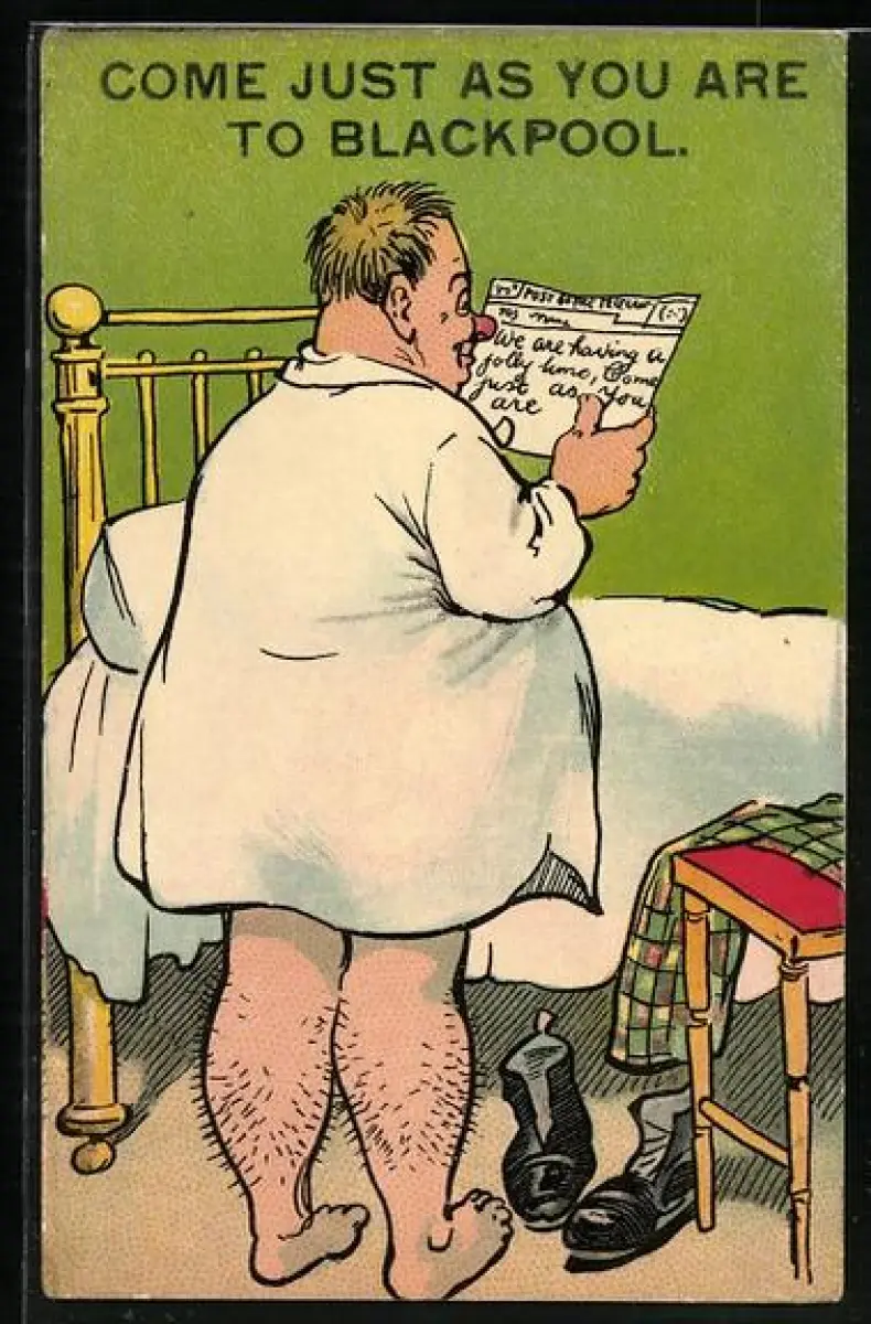 AK Come just as you are to Blackpool, Mann im Nachthemd liest Telegramm