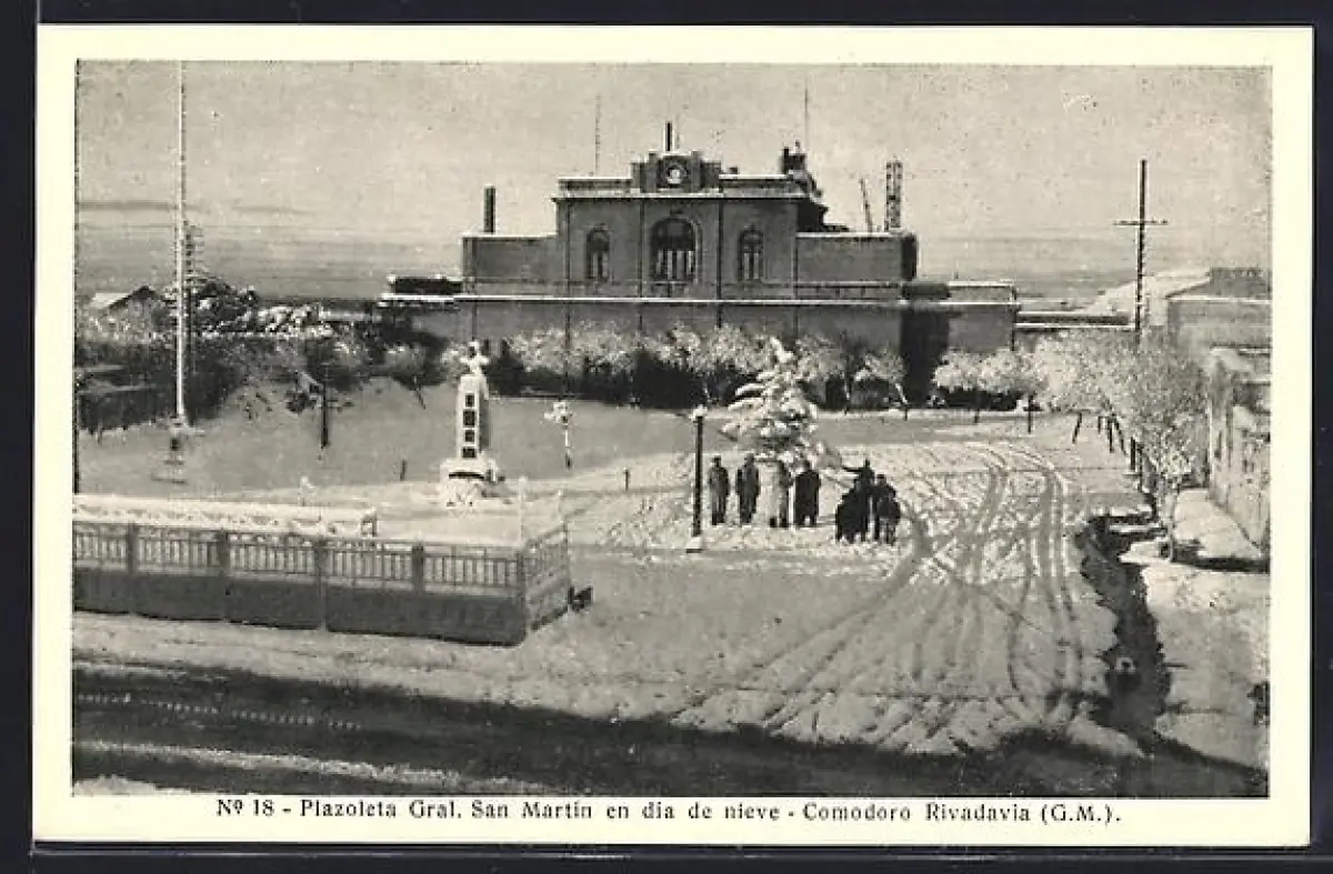 AK Comodoro Rivadavia /G. M., Plazoleta Gral, San Martín en día de nieve