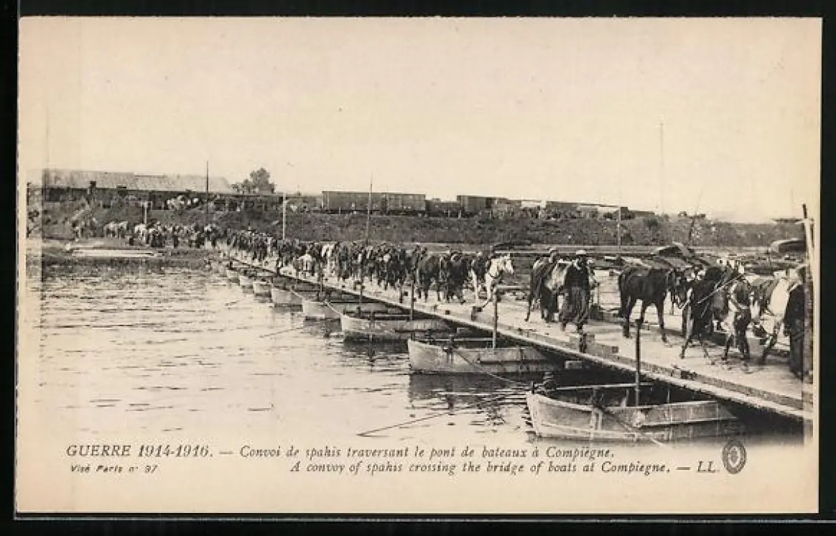 AK Compiègne, Convoi de spahis traversant le pont de bateaux, Guerre 1914-16, Soldaten mit Pferden