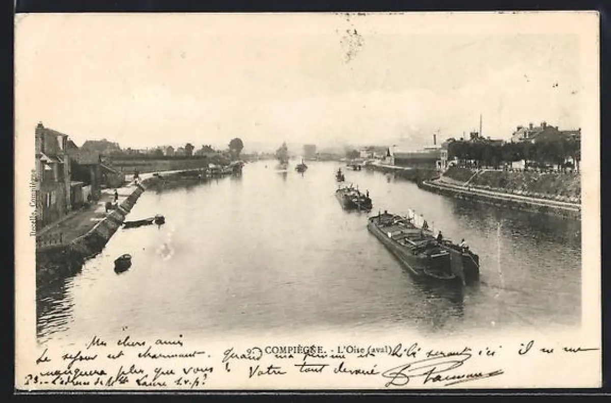 AK Compiègne, L`Oise avec des péniches naviguant sur la rivière