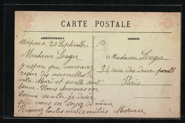 Personenbezogene Daten auf der Rückseite der Karte wurden durch blauen Textmarker unkenntlich gemacht. Die blauen Stellen sind auf die Vorderseite durchgeweicht und wirken sich negativ auf das Postkartenfoto aus