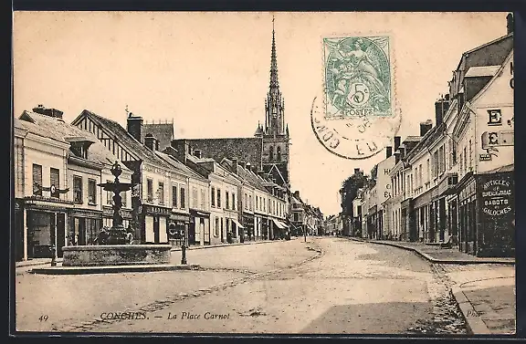 AK Conches, La Place Carnot avec église et bâtiments environnants