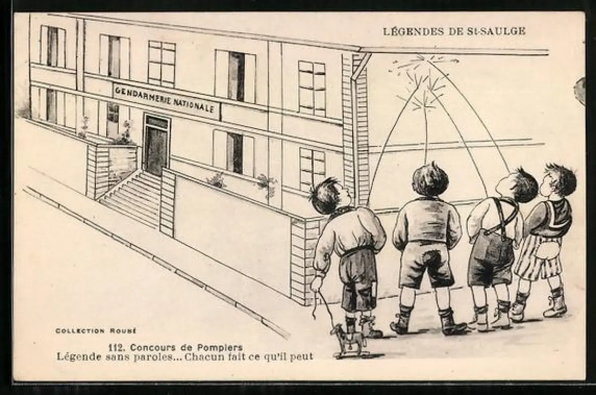 AK Concours de Pmpiers pendant la Guerre, Knaben pinkeln an Polizeigebäude