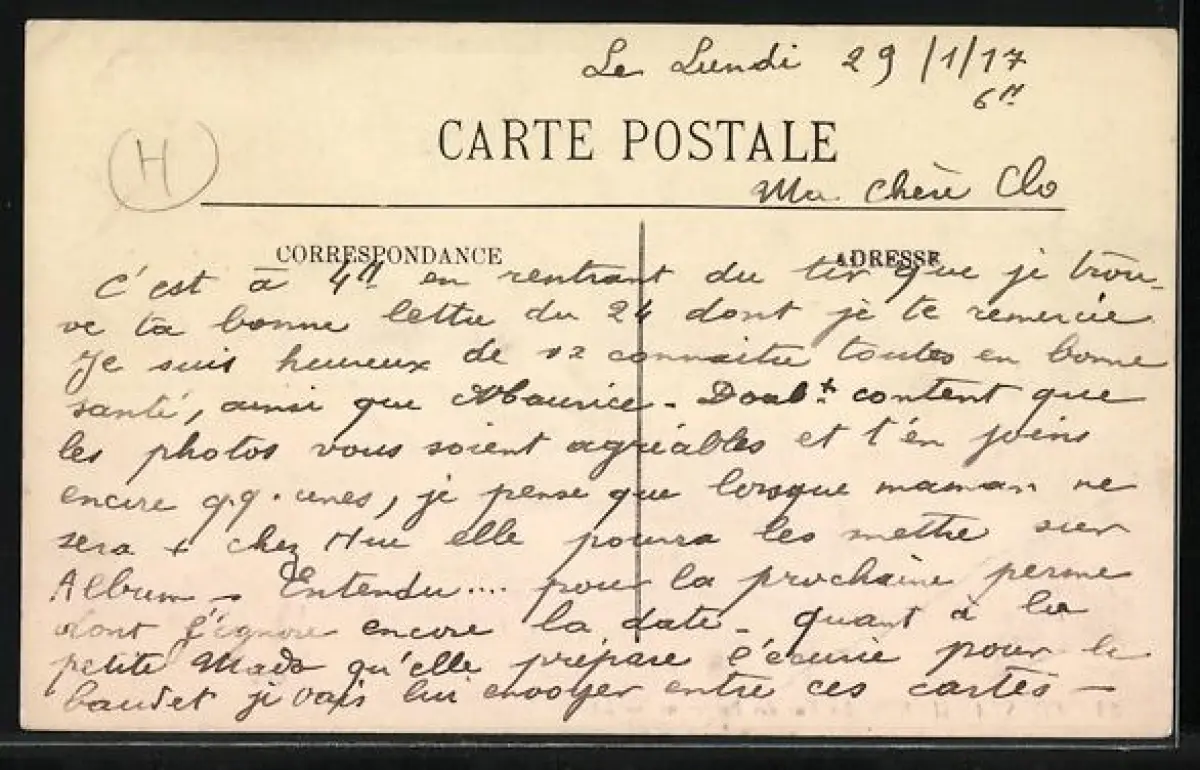 Personenbezogene Daten auf der Rückseite der Karte wurden durch blauen Textmarker unkenntlich gemacht. Die blauen Stellen sind auf die Vorderseite durchgeweicht und wirken sich negativ auf das Postkartenfoto aus