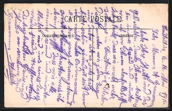 Personenbezogene Daten auf der Rückseite der Karte wurden durch blauen Textmarker unkenntlich gemacht. Die blauen Stellen sind auf die Vorderseite durchgeweicht und wirken sich negativ auf das Postkartenfoto aus