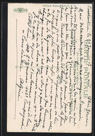 Personenbezogene Daten auf der Rückseite der Karte wurden durch blauen Textmarker unkenntlich gemacht. Die blauen Stellen sind auf die Vorderseite durchgeweicht und wirken sich negativ auf das Postkartenfoto aus