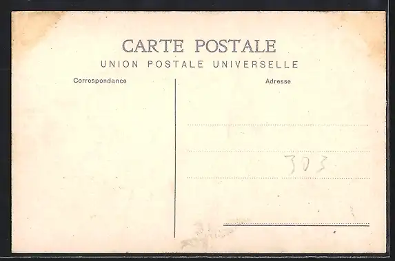 Personenbezogene Daten auf der Rückseite der Karte wurden durch blauen Textmarker unkenntlich gemacht. Die blauen Stellen sind auf die Vorderseite durchgeweicht und wirken sich negativ auf das Postkartenfoto aus