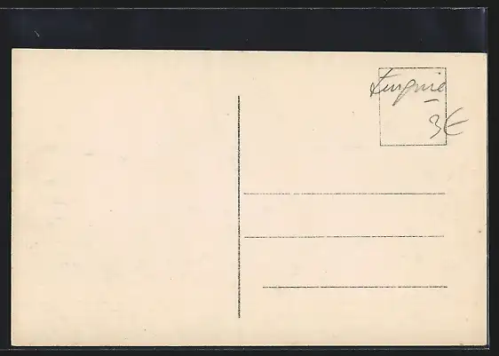 Personenbezogene Daten auf der Rückseite der Karte wurden durch blauen Textmarker unkenntlich gemacht. Die blauen Stellen sind auf die Vorderseite durchgeweicht und wirken sich negativ auf das Postkartenfoto aus