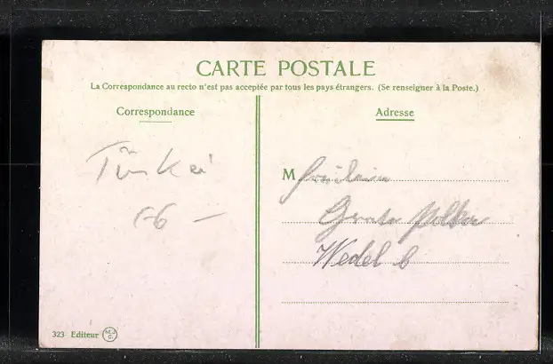 Personenbezogene Daten auf der Rückseite der Karte wurden durch blauen Textmarker unkenntlich gemacht. Die blauen Stellen sind auf die Vorderseite durchgeweicht und wirken sich negativ auf das Postkartenfoto aus