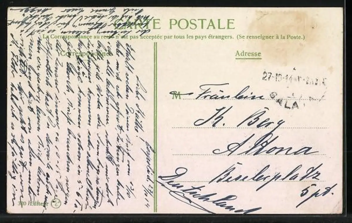 Personenbezogene Daten auf der Rückseite der Karte wurden durch blauen Textmarker unkenntlich gemacht. Die blauen Stellen sind auf die Vorderseite durchgeweicht und wirken sich negativ auf das Postkartenfoto aus