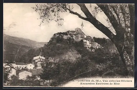 AK Contes, Vue entre les Oliviers et le village sur la colline