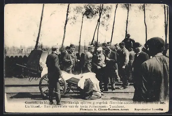 AK Contich, Bahnunglück am 21. May 1908, Verletzter wird zu Wagen geführt