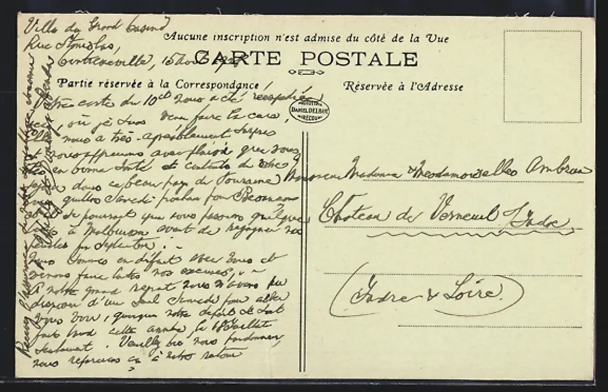 Personenbezogene Daten auf der Rückseite der Karte wurden durch blauen Textmarker unkenntlich gemacht. Die blauen Stellen sind auf die Vorderseite durchgeweicht und wirken sich negativ auf das Postkartenfoto aus