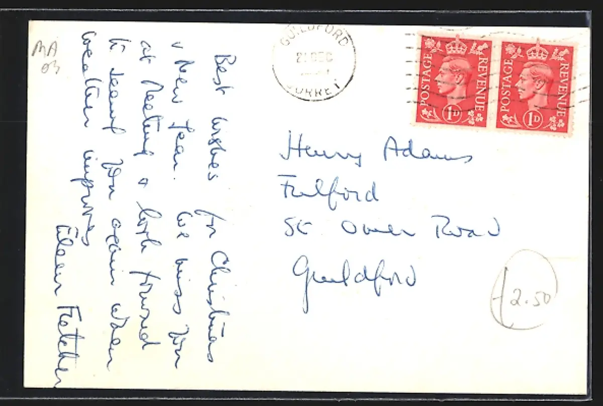 Personenbezogene Daten auf der Rückseite der Karte wurden durch blauen Textmarker unkenntlich gemacht. Die blauen Stellen sind auf die Vorderseite durchgeweicht und wirken sich negativ auf das Postkartenfoto aus