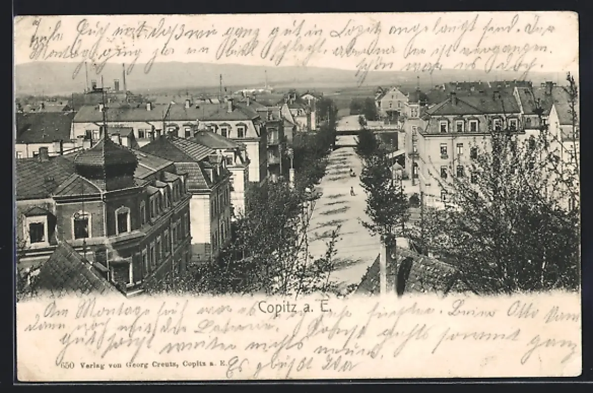 AK Copitz a. E., Strassenpartie und Wohnhäuser aus der Vogelschau