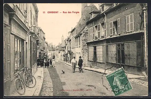 AK Corbigny, Rue des Forges animée avec passants et vélos