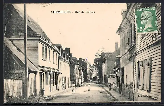 AK Cormeilles, Rue de Lisieux animée avec passants et bâtiments anciens